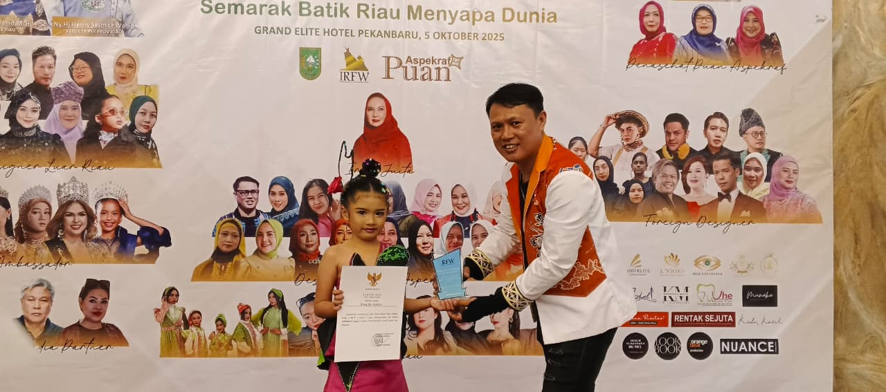 VLOOD.ID - Shaqilla Azzahra, siswi kelas 2 SDN 001 Tembilahan Kota, menorehkan prestasi membanggakan dengan meraih dua penghargaan bergengsi di Pekanbaru dalam satu hari, Minggu (5/10/2025). Gadis cilik yang akrab disapa Iwa ini menerima penghargaan langsung dari Gubernur Riau setelah tampil memukau pada ajang internasional Riau Fashion Week (IRFW) Season 2 dan juga meraih Juara Harapan 1 pada Lomba Fashion Show Kids Hari Batik Nasional 2025 yang digelar di hari yang sama.