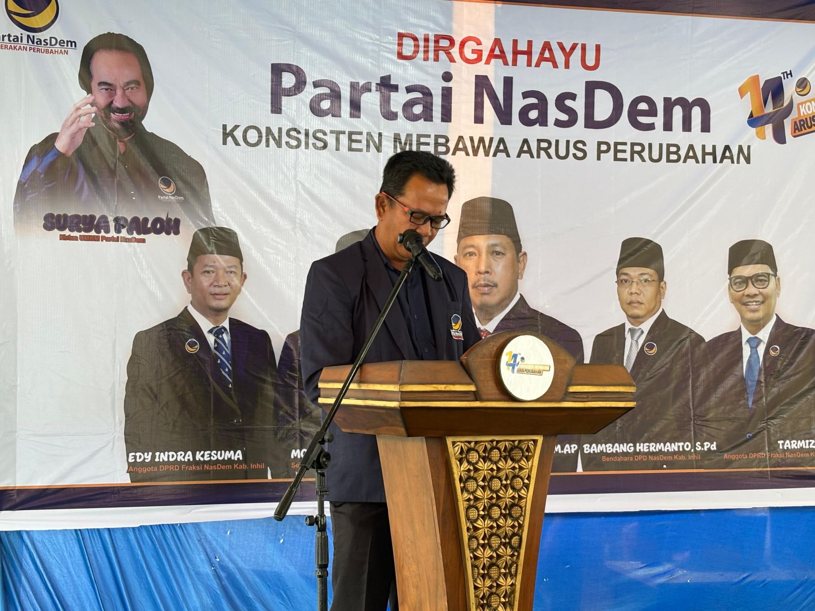 Ketua Pelaksana HUT ke-14 Partai NasDem Inhil, Edy Indra Kesuma, menyampaikan rasa syukur atas terselenggaranya acara tersebut.