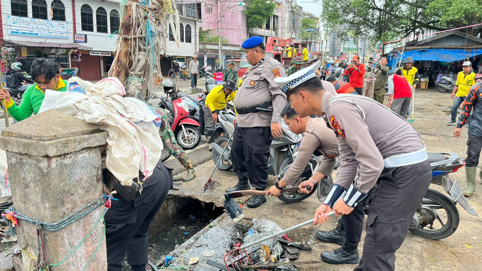 Seluruh personel bekerja bersama membersihkan saluran got dan kawasan rawan banjir di sekitar Tembilahan serta sejumlah wilayah Polsek jajaran.